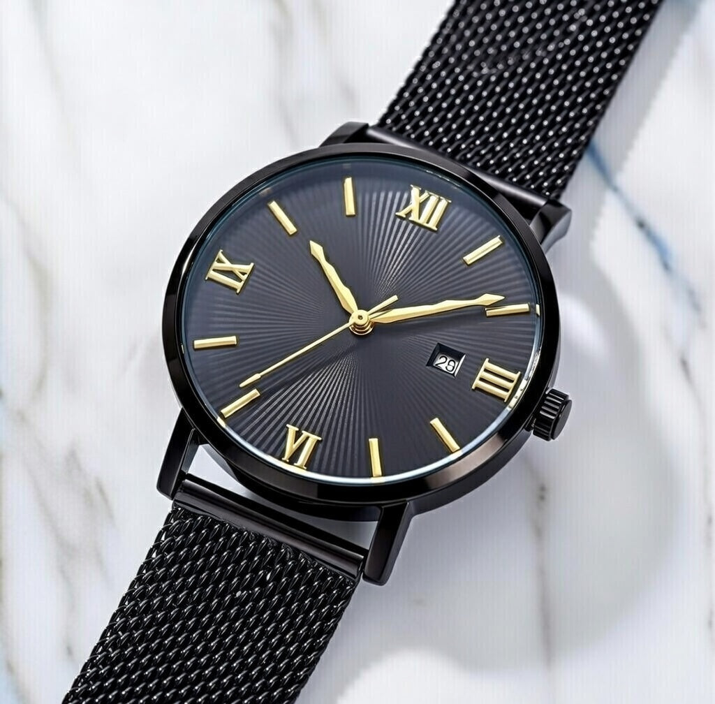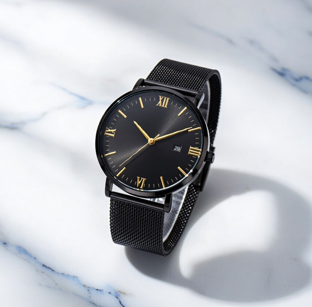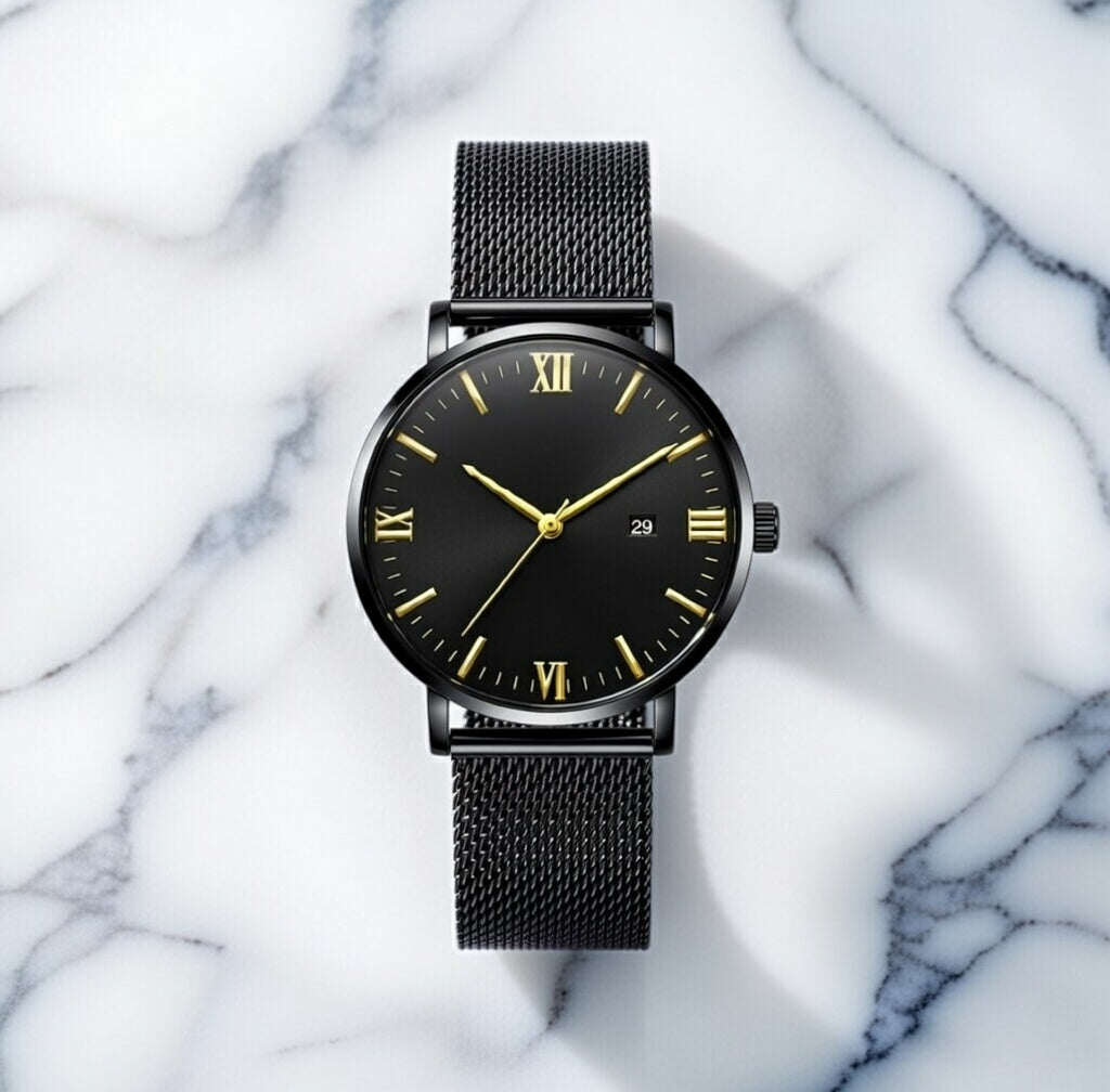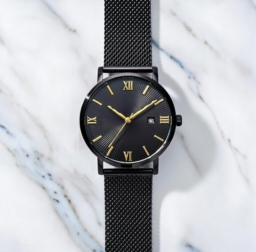The Ylontis Aurelius blends minimalist design with refined detailing, creating a timepiece that reflects timeless elegance. Its black dial is enhanced by gold-toned accents, offering a subtle contrast that elevates its classic aesthetic.